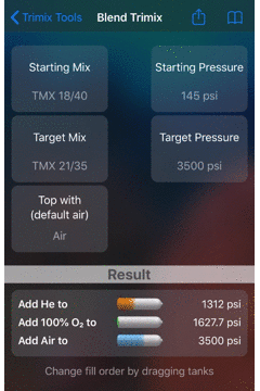 Trimix Tools shows you the target pressure after you’ve added each gas. In some case, you may need to adjust your fill order because of the available pressure in your supply gases. You can easily change the fill order in the Standard Trimix, Helitrox and Bleed Down tools by dragging the tank image for the supply gas that you want to reorder to it’s new location. The target pressures will adjust as you drag the supply gas to show the new values.Once you’ve changed the fill order, Trimix Tools will remember it for the next time you use the tool.